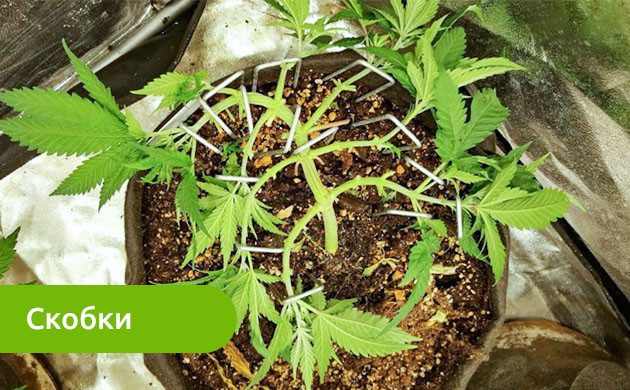 Данная техника повышения урожайности не требует покупки дорогостоящего оборудования, удобрений или стимуляторов. Все, что требуется от гровера, – это наличие свободного времени и правильное выполнение подгиба. Для фиксации стебля могут использоваться изолента, шнурки или мягкие веревочки, которыми ветви прикрепляются через отверстия к краям горшка. Кто-то отдает предпочтение скобам, которые обратной стороной углубляются в грунт, кто-то берет на вооружение плотную проволоку в мягкой оплетке.