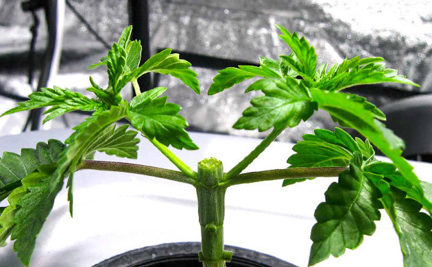 Чтобы до начала цветения кустики успели сформировать желаемую форму кроны, начинать тренировки нужно на ранних этапах вегетации. Прежде всего, для стимуляции образования боковых побегов кусту нужно будет сделать топпинг. Делать это лучше, когда растение сформирует 4-6 пар листьев. Можно срезать только одну верхушку, а можно удалить до трех верхних междоузлий. В нижней части куста стебель несколько толще, и формирование новых побегов пойдет быстрее. Топпинг можно повторять в процессе развития каннабиса несколько раз, стимулируя образование еще большего количества основных стеблей.