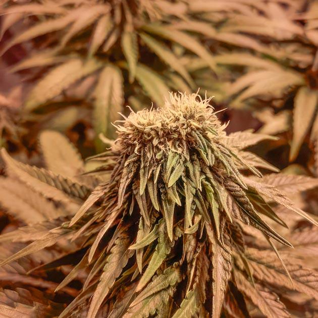 Сейчас кусты полностью остановились в росте, и все питание уходит в налив шишек. Структура плотная, листья здоровые, цвет насыщенный, на свету блеск трихом невероятно радует глаз. При ближайшем осмотре заметил еще одну мутирующую шишку, которая тоже выглядит будто сдвоенной. Причем она была уже на другом растении. Причудливая генетика.