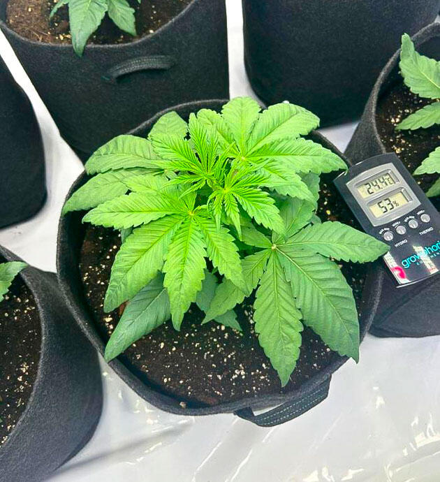 Кусты отлично прижились после пересадки и быстро пошли в рост. На 17-й день я выполнил первый полив легким раствором CANNA Terra Vega (2,5 мл/л), а на 19-й день провел топпинг. Растения отреагировали спокойно, и уже через пару дней из верхних узлов пошли новые ответвления.