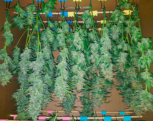 Обрезал сразу все четыре куста и повесил сушиться вниз головой. Чтобы пометить, где какой сорт, использовал для крепления биндеры разного цвета (такого, как и на стикерах).