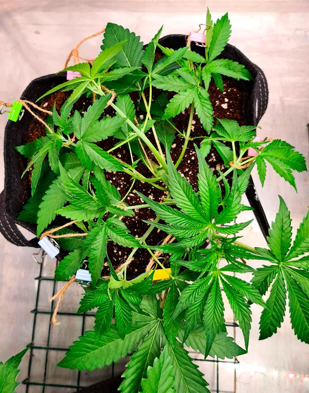 Cherry Cola Auto развивается просто замечательно. После LST веточки значительно вытянулись, после чего также были подвязаны-подогнуты в разные стороны. Получаются кустики с отличной открытой структурой и достаточно крепкими ветками. На этой неделе я удобрял растения один раз и дважды поливал чистой водой. Показатель ppm на дренаже – 300. Я не хочу сильно пичкать кустики удобрениями. Тем более никаких признаков дефицита не видно, развитие в норме. Судя по состоянию кустов, они скоро зацветут. Также на этой неделе я удалил часть листвы, по 3 пары с растения.