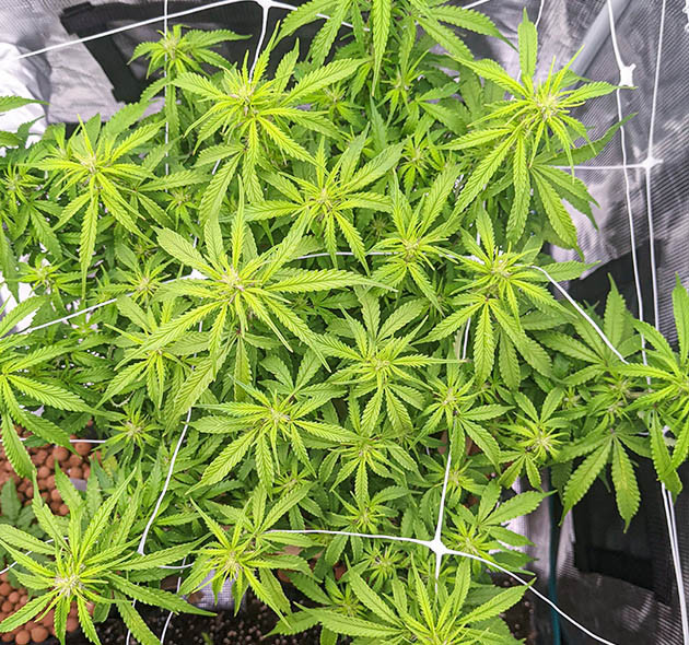 На пятой неделе я отключил полив на два дня, так как растишка выглядела слишком залитой. О чрезмерном поливе сигнализировала и высокая влажность – 75 %. Поэтому, когда я возобновил полив дважды в сутки, я поставил в тент небольшой осушитель воздуха. Таким образом, удалось снизить влажность до приемлемых показателей. Также я заметил признаки дефицита кальция, поэтому увеличил количество CalMag в растворе до 10 мл/л и продолжил обрабатывать лёгким раствором “КалМага” по листу. Несмотря на перечисленные проблемы, растение выглядело хорошо, я бы сказал, на 8 из 10. Оно было невысокое и очень густое, из-за чего свет плохо проникал в нижние ярусы растения. Благодаря LST и надлому на ранней стадии “Горилла” сформировала восемь ветвей, а центральный стебель был очень крепким.