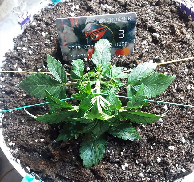 Растение развивается очень хорошо, быстрее, чем я ожидал. Пожалуй, это самый бодрый автоцвет на моем опыте. К 13-му дню уже разрослись боковые побеги, поэтому начал гнуть растишку по методике LST. До этого специально не поливал кустик 2 дня, чтобы он лучше гнулся, и я не повредил молодые стебли. Использую обычные резинки, в принципе, на фото всё отлично видно. Таким образом мне удаётся сформировать невысокие кустики, на которых сформируется много бутонов за счет развития боковых ветвей. После того как согнул малышку, дал по листу «Эпин» от Буйских, чтобы минимизировать стресс. На следующий день дал полдозы удобрений GHE (дозировка по инструкции).