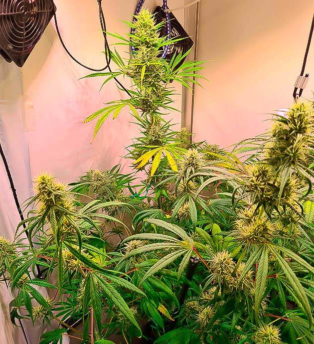 Цветение началось и идет хорошо. Листвы становится все больше, а соцветия постепенно формируются. На седьмой неделе пришлось прибегнуть к дефолиации и LST-подгибу. Растишки отлично перенесли тренировки, никаких признаков стресса я не наблюдаю. По высоте они уже вытянулись до 58 сантиметров.
