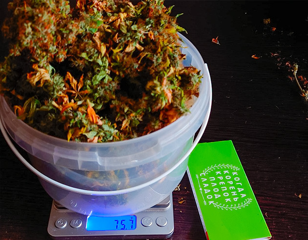 Спустя неделю урожай высох. Сушил в полной темноте при комнатной температуре (26-30 градусов). После сушки вышло 75 г сухих бутонов без учета трима.