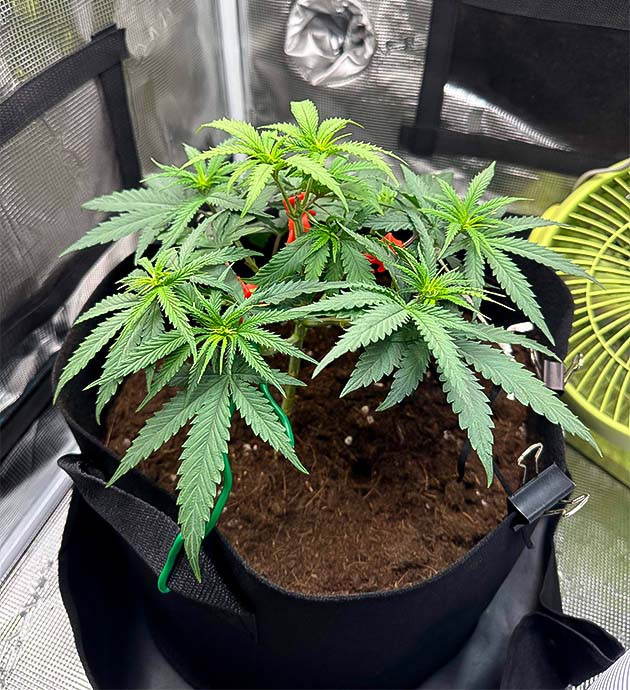 Переход на следующую стадию развития прошел успешно. Я продолжаю использовать LST-подгиб и периодически срезаю ненужную листву. Также я увеличил концентрацию всех используемых удобрений до 1,5 мл/л.