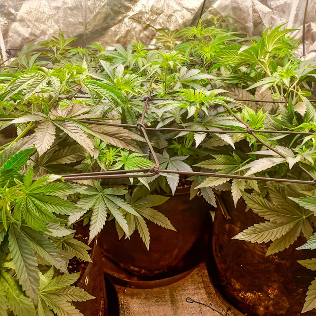 На пятой неделе я продолжил поливать и гнуть кустики по аналогии с предыдущей, ничего в последовательности своих действий и количестве воды не менял. Удобрения всё еще не даю. Рост кустов к концу недели составлял 20-25 сантиметров. На 35-й день на высоте в 25 сантиметров натянул сетку скрог и аккуратно растянул достающие до неё макушки в ячейки. Обычно на этом этапе я делаю дефолиацию, но на этот раз решил попробовать без удаления листвы, только при острой необходимости.