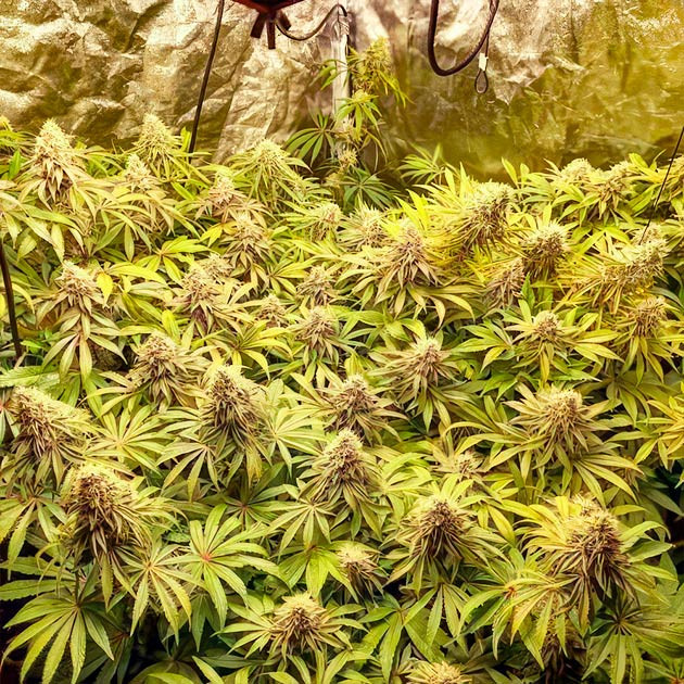 В палатке наступила осень, растихи меняют цвет. Много листьев желтеет, выцветает. Некоторые макушки приобретают рыжевато-красный оттенок. Несколько кол окрасилось в фиолетовый цвет, будто базилик. Общая картина действительно напоминает осень в парке: листва разного цвета, где-то еще зеленая, а где-то уже желтая, в некоторых местах красная, а в некоторых уже и вовсе засохшая. Заключительные две недели грова. Чтобы не лить большие дозы воды, просто промывал через день, начиная с 4 литров, затем по 3, затем по 2 литра на куст. Срубил кусты на 107-й день от каски, или на 64-й день цветения.