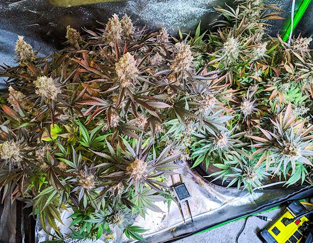 Последние недели грова я не вел еженедельный журнал и записи в целом. Да и записывать особо было нечего, я просто проверял состояние шишек, поливал и кормил кусты по мере необходимости. Периодически убирал отмершие листья. С середины 18-й недели начал промывать кусты и перестал вносить удобрения. К концу грова листья на верхних этажах растений стали темно-зеленого и фиолетово-оранжевого цвета. После очередной проверки трихом, когда количество янтаря составляло примерно половину, я выключил свет на 72 часа, после чего срубил свои «Супер Лимоны».