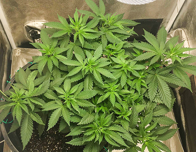 На четвертой неделе растение переехало в горшок на 14 литров. Высадил ближе к краю горшка для удобства тренировок. Через пару дней начал аккуратно гнуть кустик в разные стороны, а еще через пару дней сделал топпинг. После этого растение получило свою прежнюю дозу удобрений, но с большим количеством воды. В почве много азота за счет добавок, из-за этого Bio-Grow будет усваиваться немного дольше. Пока развитием кустика полностью доволен.