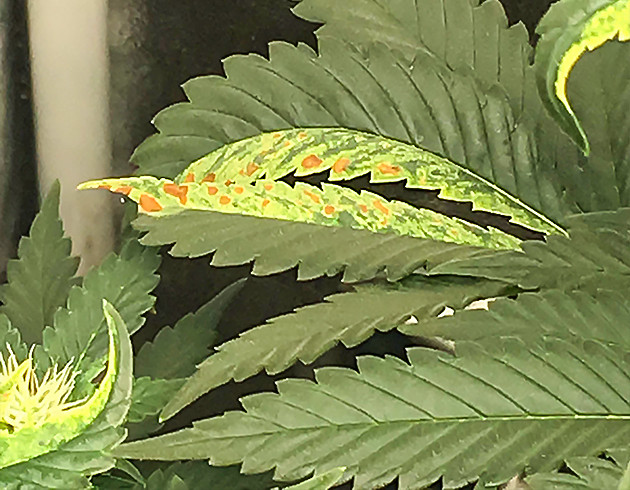 В начале шестой недели обнаружил признаки вируса табачной мозаики на некоторых листьях. Перелопатив форумы и интернет, пришел к выводу, что сильно замедлить развитие или навредить кусту этот вирус не должен. Поэтому я просто забил, всё выглядело не так уж плохо. На кусте сформировалось 12-14 макушек по моим приблизительным подсчетам.