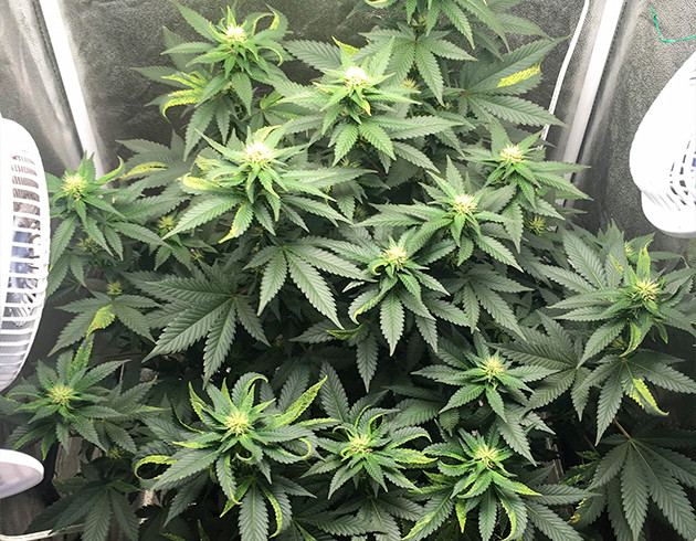 На восьмой неделе сменил световой цикл на 12/12: настала пора переводить растение в цвет. Добавил еще одну фитолампу на 60 W. Таким образом, общее количество света составляет 120 W. В почву добавил немного муки из рыбьих костей и гранулированных гуминовых кислот. С переходом на цвет схема питания такая: