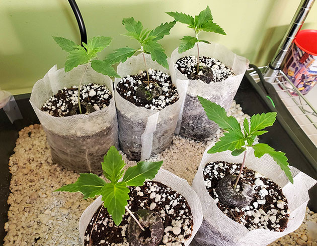 Проростки были высажены в торфяные таблетки, которые спустя пару дней были отправлены в небольшие бумажные горшочки с кокосовым субстратом. Сначала держал влажность на уровне 75 %, потом снизил до 60 %, так как мне показалось, что саженцы немного недовольны таким количеством влаги. После того как на всех «Лимонах» появилось по первой паре полноценных листьев и начал зарождаться второй этаж, они получили легкую подкормку с поливом, «компот» в 300 ppm. На данном этапе они были еще не в боксе, а в специальном аквариуме. Условия в нём были такие: