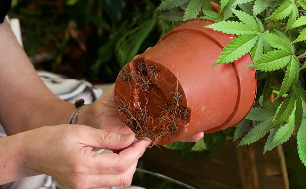 Первым делом стоит проверить почву. Смесь в горшке с марихуаной должна быть немного влажной, но не сухой. В противном случае засохшие комки грунта могут отрывать части корней. Как мы уже упоминали, с момента последнего полива должно пройти двое суток. Землю с корней ни в коем случае нельзя отбивать, она выступает своего рода защитой, а также снижает стресс.