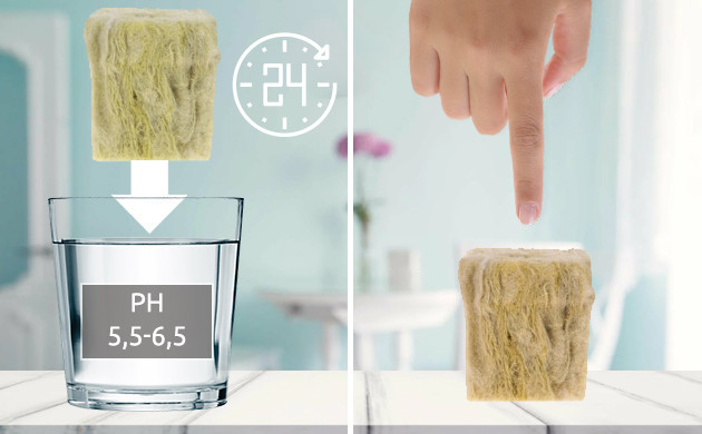 - Перед тем как помещать семя в кубик минваты, его следует примерно на сутки замочить в питательном растворе с показателем ppm 100-200, приготовленном с использованием фильтрованной или покупной воды с pH 5,5-6,5.