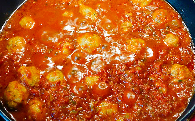 Шарики слегка обжариваются на сковороде в подготовленном масле до золотистого цвета, после чего заливаются томатным соусом и тушатся так под крышкой 10 минут на слабом огне. Готовое блюдо вкусно как само по себе, так и с гарниром, рисом или лапшой.