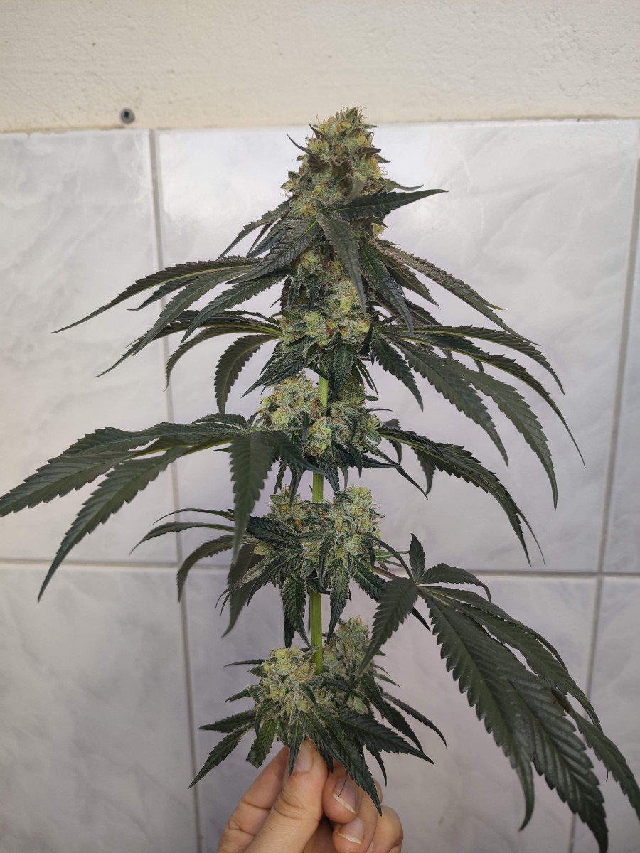 В целом неплохое впечатление. Рост не слишком высокий, дополнительно можно растянуть немного куст. Отличное ветвистое растение, больше на сативу похожее. Оттенок листвы и шишек меняется, становится синевато-красным. Шишки крупные продолговатые сативные. Да и воздействием больше на сативу похожи. И очень вкусные сладкие.