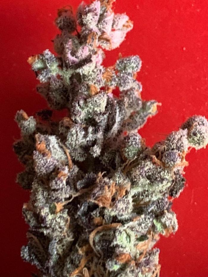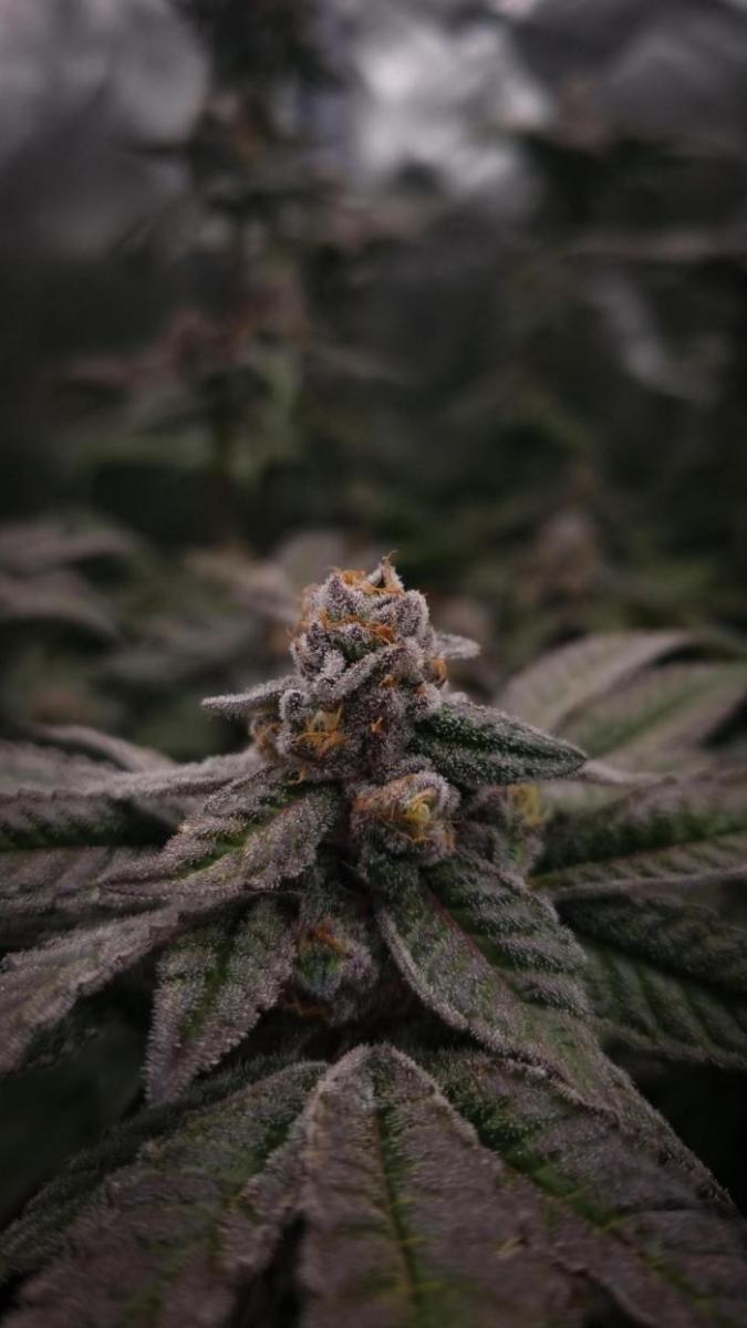 Покрытие трихомами было эпическим, и некоторые веерные листья были почти полностью ими покрыты, чего раньше никогда не случалось. Шишки среднего размера и твердые как камень. В последние дни перед харвестом у растения словно немного выцвел темно-фиолетовый цвет. Запах был землистым, древесным и кушевым.