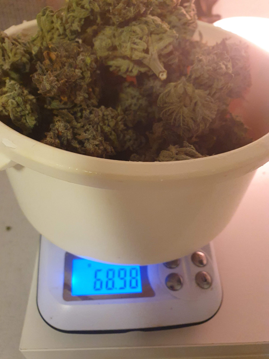 Проблем с балансом калия и магния нет, несмотря на высокую интенсивность светодиодного освещения (пиковая интенсивность 1200 PPFD без CO2). После 9 недель цветения под экраном 60x60 см урожайность составила 200 г сухого продукта с растения плюс 12 г хэша из обрезков.