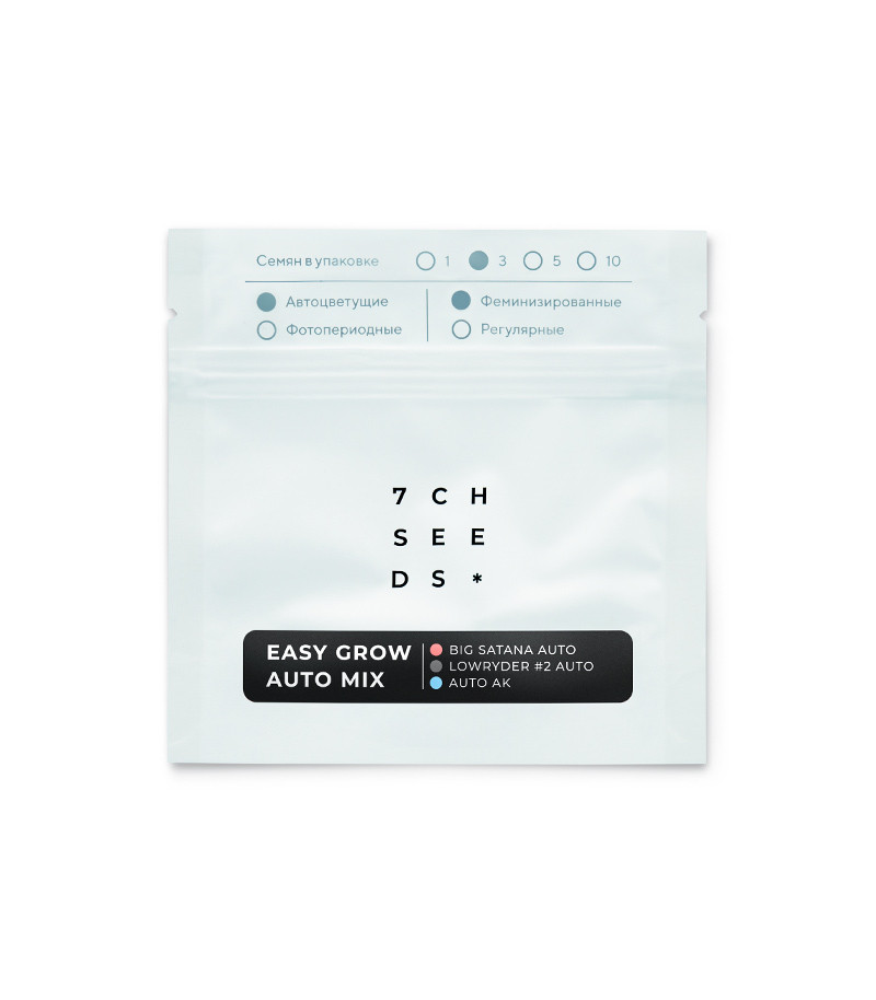 Микс семян конопли Easy Grow Auto Mix от сидбанка Семяныч включает в себя сорта каннабиса, которые сможет вырастить любой гровер. Это Auto AK, Lowryder #2 и Big Satana Auto. Простота в уходе никак не отразилась на качестве – все три сорта получают исключительно положительные отзывы садоводов.