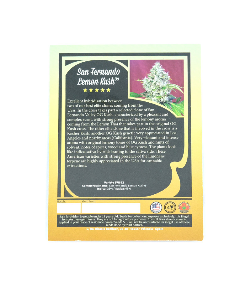 Семена сорта San Fernando Lemon Kush fem (Sweet Seeds) Испания, Феминизированные, Фотопериодные, ТГК-14 - 21