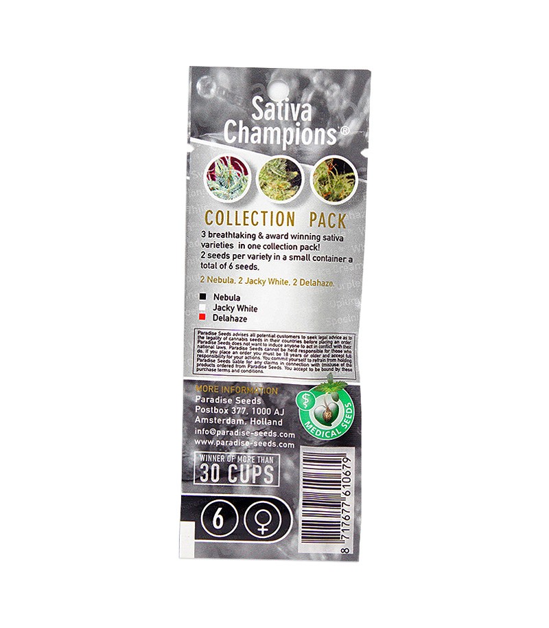 Коллекционный набор Sativa Champions– это 6 сортовых семян, по два семечка трех сативных сортов. Знакомьтесь с особенным женским трио от Paradise Seeds!